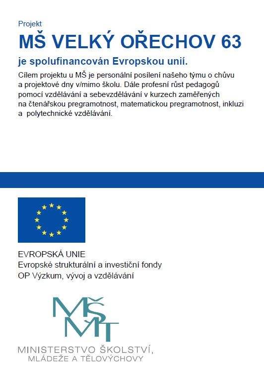 Rok 2015 - MŠMT ČR - částkou 40.000,- Kč v rámci výzvy Podpora logopedické prevence v předškolním vzdělávání v roce 2015 podpořen projekt Podpora logopedické prevence v Mateřské škole Velký Ořechov, okres Zlín, příspěvkové organizaci.